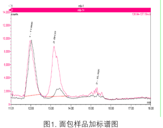 從市場和超市中選取兩種面包產品,上述離子色譜條件分析,所得回收率結果分別為98%和106%。樣品加標色譜圖如圖2所示。表1為面包樣品的測定結果。由這些數據可以看出,在所檢測的兩種面包中均含有不同含量的溴酸鹽。